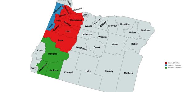 Salem Office (Red): Marion, Polk, Linn, Yamhill, Benton, Clackamas, Multnomah, eastern Lane Counties. Member RMLS of Portland and Willamette Valley MLS of Salem.